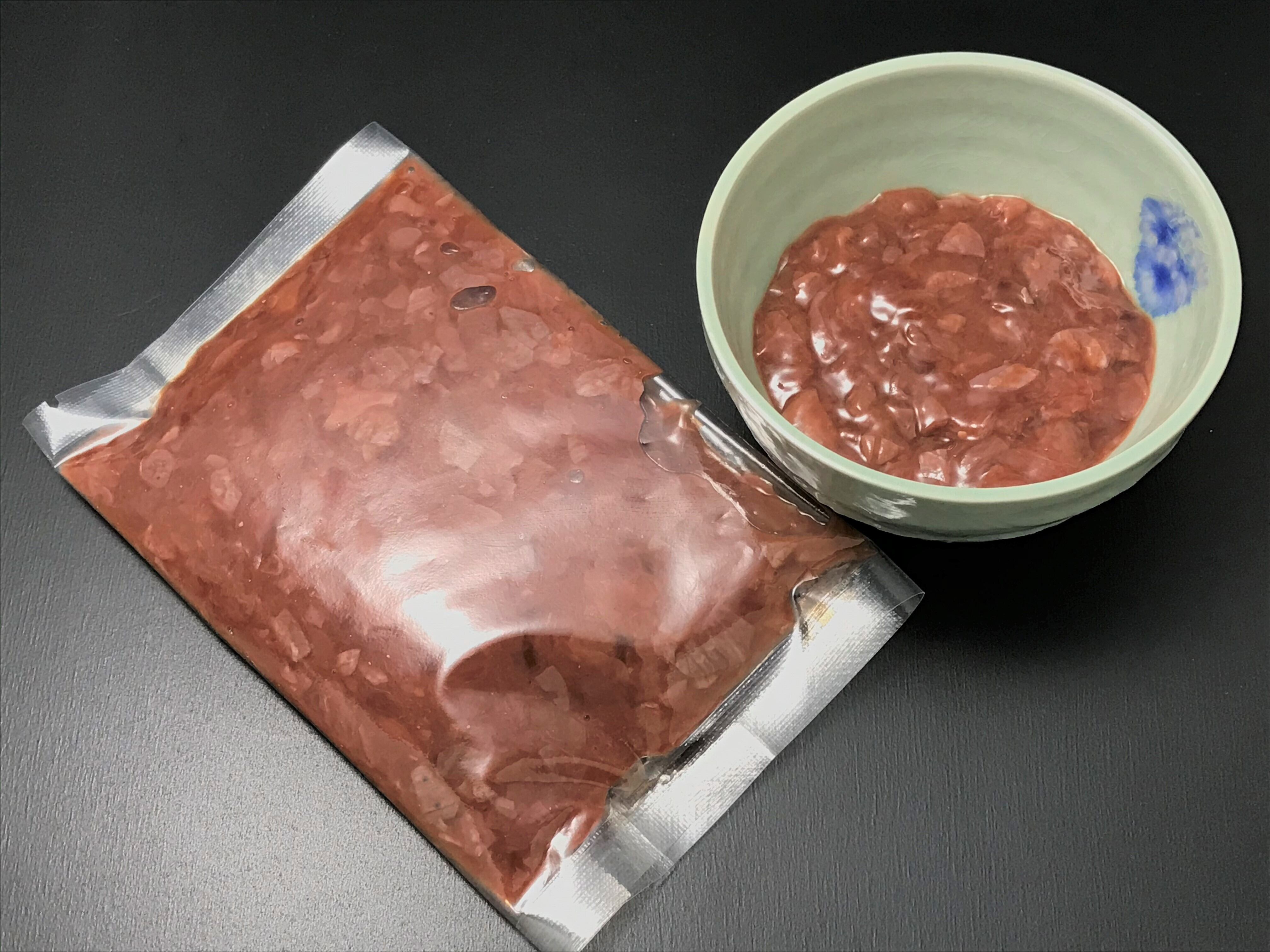 原材料名:塩蔵熟成まぐろ内臓(焼津製造)(まぐろ内臓、食塩)、本味醂、魚介エキス / 酒精、ソルビット、調味料(アミノ酸等)、着色料(紅麹色素、ラック色素)、増粘多糖類、甘味料(ステビア、甘草)
